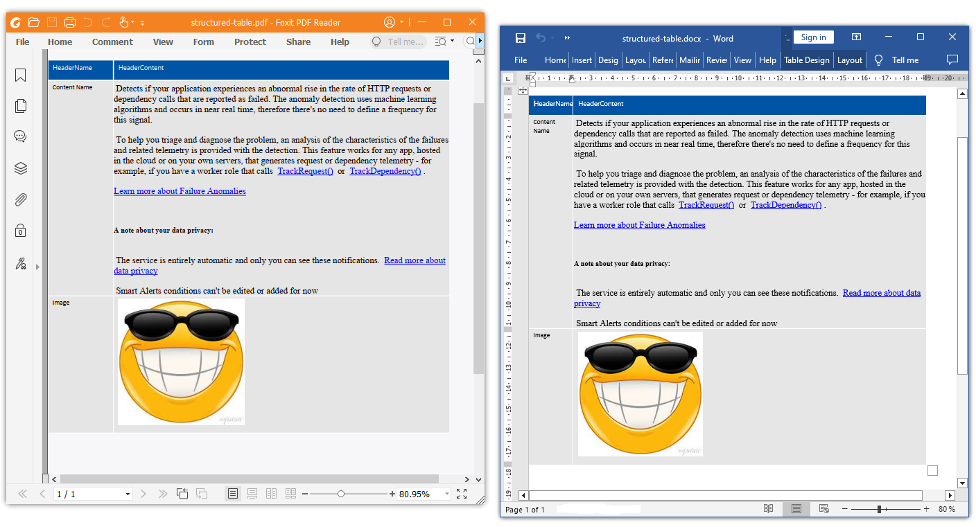 Заполним ячейки внутри таблицы текстом, гиперссылками и изображением и сохраним это в PDF и DOCX.
