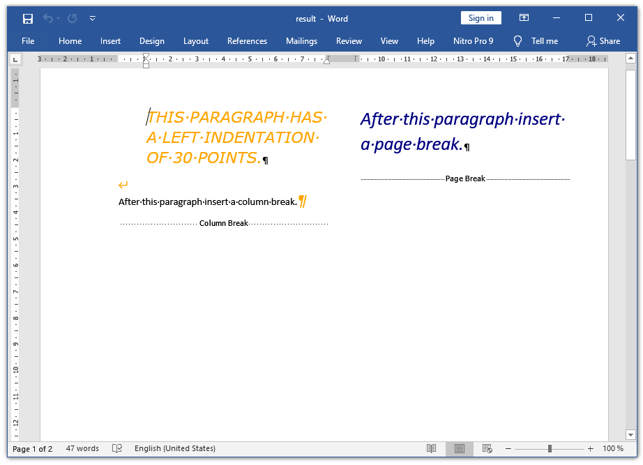 db.Writeln("This paragraph has a Left Indentation of 30 points.")