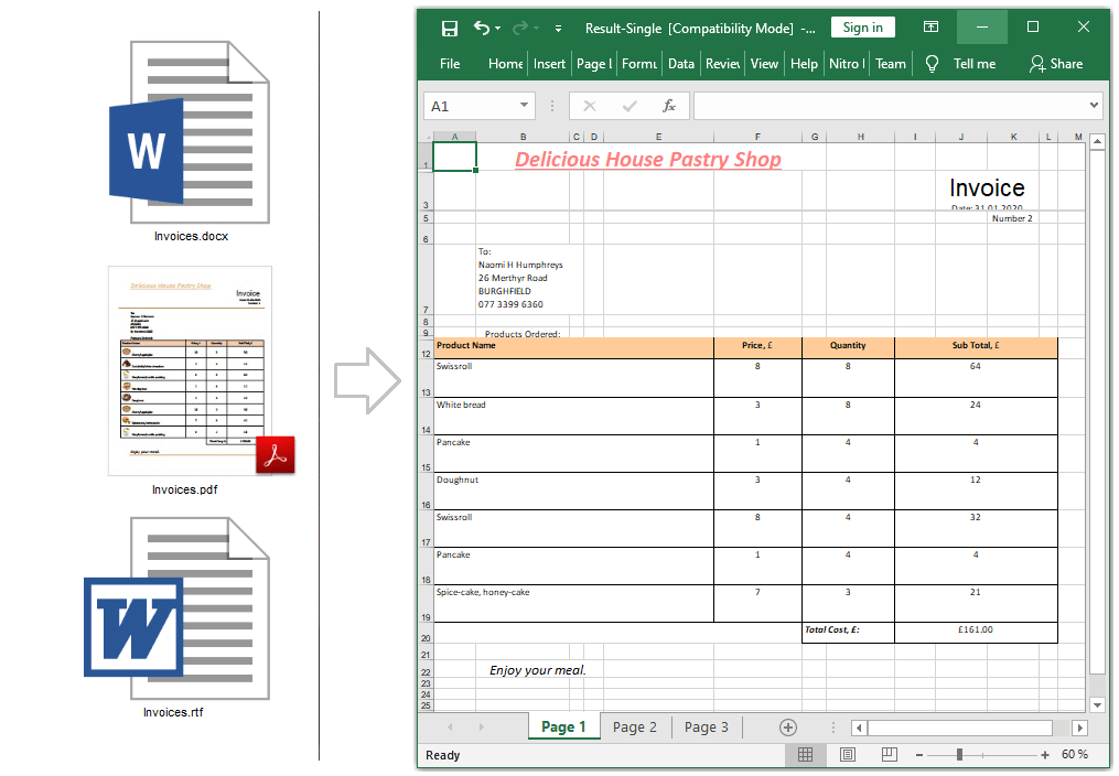 В этом примере показано, как преобразовать все файлы (.pdf, .docx, .rtf), расположенные в одном каталоге, в один файл рабочей книги формата XLS.