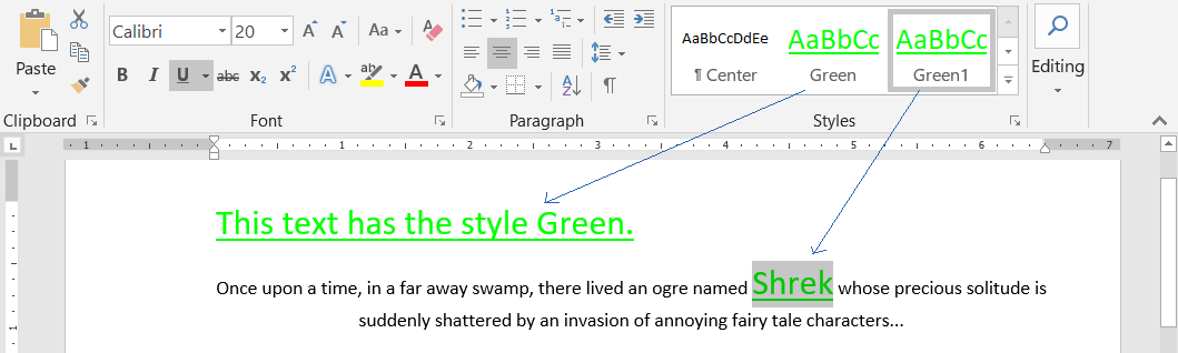 Абзац содержит текст "Shrek" выделенный одинаковым стилем с тем же названием "Green" (Calibri,
