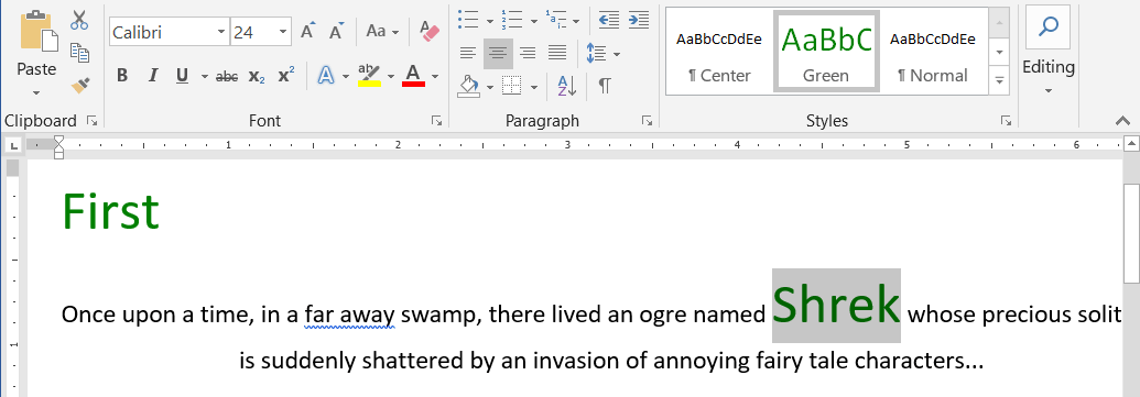 Абзац содержит текст "Shrek" выделенный стилем "Green".