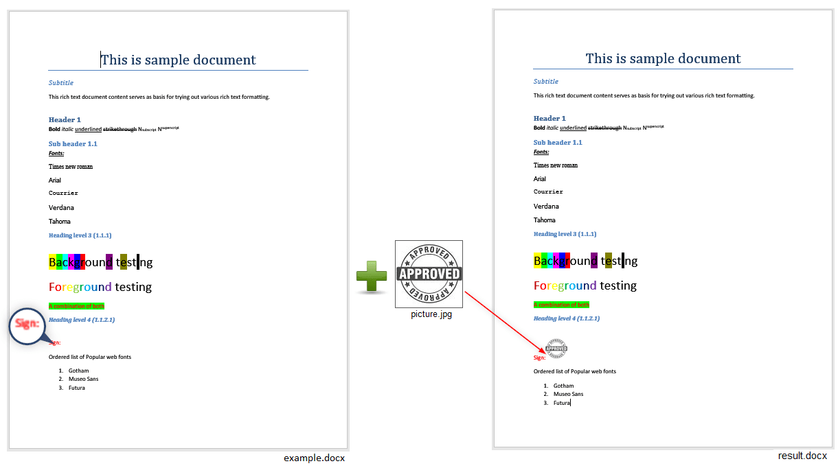 // In this example we'll insert the picture to 1st after the word "Sign:".