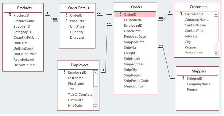В нашем примере мы возьмем готовую базу данных «Northwind.mdb». Мы будем экспортировать данные из таблиц: Orders, Customers, Shippers, Employees, [Order Details] и Products для создания нашего отчета.