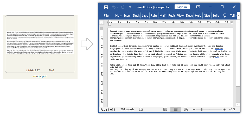 ' Here we'll recognize an image (perform OCR) containing a text on English, Russian and Vietnamese.