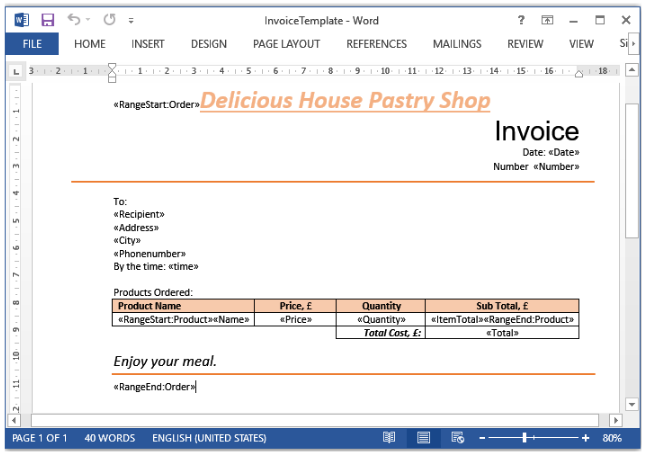 Во время процесса слияния соответствующие поля шаблона для каждого “Order” заполняются данные из в XML-документе столько раз, сколько записей содержится внутри каждого вложенного RangeStart и RangeEnd области слияния.