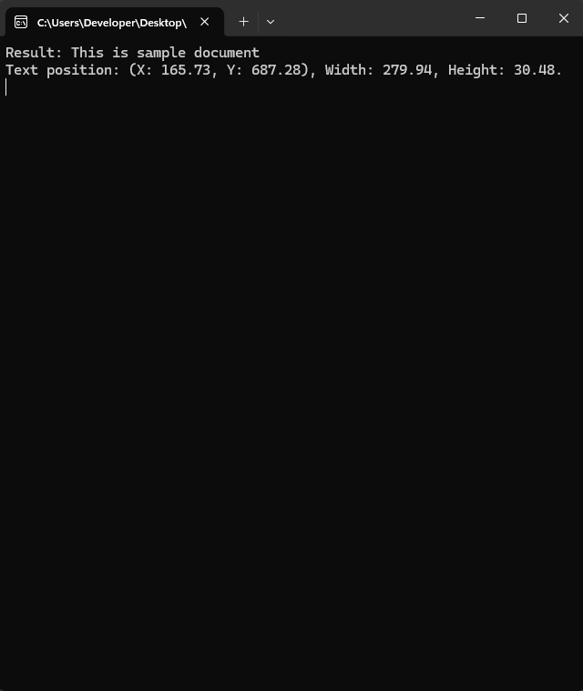 Console.WriteLine($"Text position: " & $"(X: {text.Bounds.Left:0.##}, " & $"Y: {text.Bounds.Bottom:0.##}), " & $"Width: {text.Bounds.Width:0.##}, " & $"Height: {text.Bounds.Height:0.##}.")